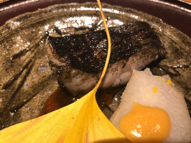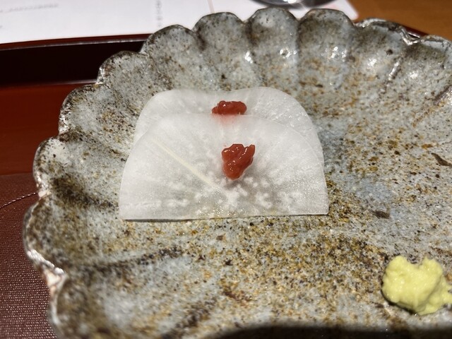 →羅臼と鰹節のお出汁のインパクトも素晴らしかったのですが、こちらは超軟水の日本酒仕込み水を使う事で出汁の旨みが広がるのではなく直線的に舌に浸透してくる初めての経験に感動!こちらも完全に白甘鯛は脇役と思える程のお出汁の旨み(^^)ただそこに庄原の松茸だけは凛として香りを放って…素晴らしい食感と香りと甘みを満喫しつつ、お出汁に溺れる幸せに感謝m(_ _)m
