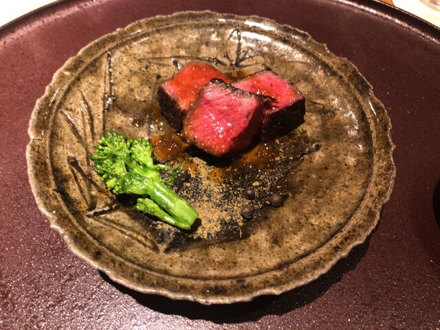 →楽しみにしていた大沼カットの高森和牛(^^)この日はサーロイン部位ですが、霜降りレベルは穏やかでまさに私の好みの部位(^^)それを素晴らしいお出汁でしゃぶしゃぶと平野大将が仕上げてくださるのはまさに至福の時!黒七味も素晴らしいアクセントですね!旨い!