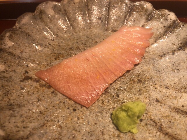 →この日のお造りは九絵の部位違い三兄弟から(^^)こういう食べさせ方で楽しませるのは流石平野大将ですね!5日寝かせの身は紅葉ポン酢に10秒浸して、九絵らしいしっかりとした旨みを楽しみ、背トロ、腹先は山葵と塩でまるでお肉のような肉肉しさを満喫させる!本当流石です♡