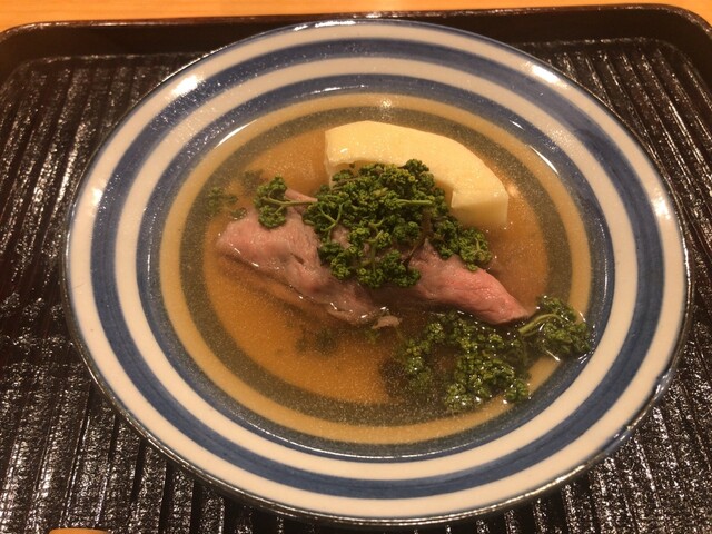 →お出汁は血合抜きの鰹節と寝かした利尻昆布で…しっとりと深い旨味…幸せ…そして竹の子と甘鯛への火入れも完璧!神馬草の食感も滑りと歯応えが楽しい。うっとり…