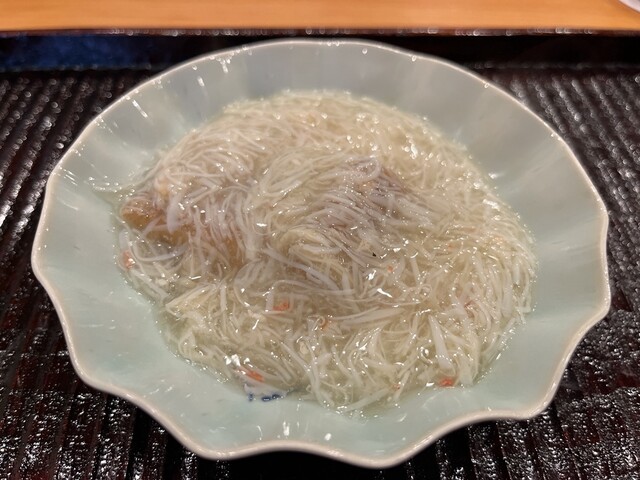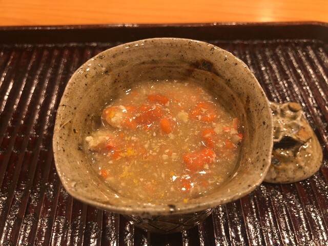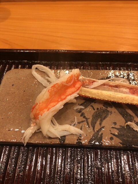 →光井大将がこの日のために用意してくださった松葉蟹は勿論甲羅は薄らピンクを帯びた透明でガニも勿論透明(^^)これがやっぱり産地と仕入れの力なんでしょうね!物と鮮度が違います!その松葉蟹の1番脚を丁寧に捌いてよく冷やした濃いめの昆布出汁で華を咲かせ、最後に蟹用にブレンドした醤油を少しだけ垂らして眼前に…勿論遠慮なく口に運びますが、驚く程甘い!旨いのは勿論甘味が突き抜けて…感動♡