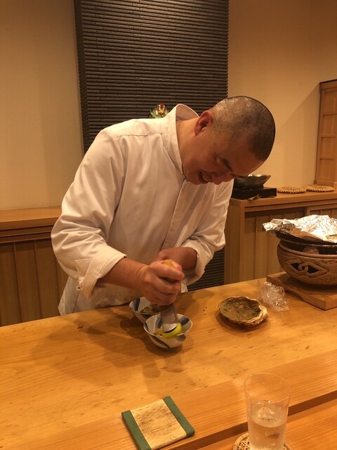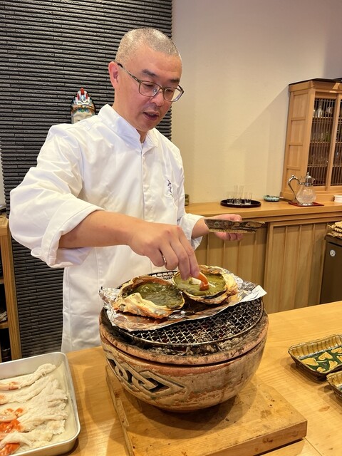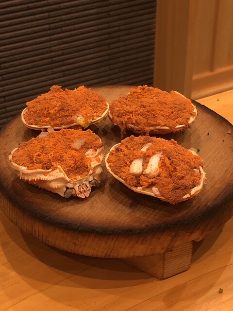 →続いては光井大将が七輪を…という事は焼き松葉蟹がスタートです♫この日はまず光井大将が捌く蟹脚の透明感に驚き、炭火で焼き上げる際の蟹身の隆起に驚き、口に運んだ際の味わいの美しさ、旨みと甘味のコラボレーションに驚く極上の焼き蟹\( ˆoˆ )/ただただ旨い♡