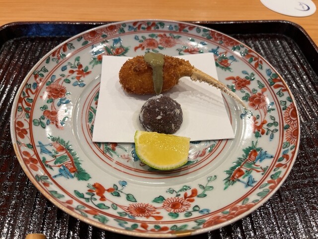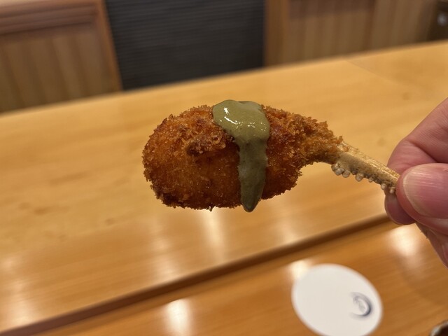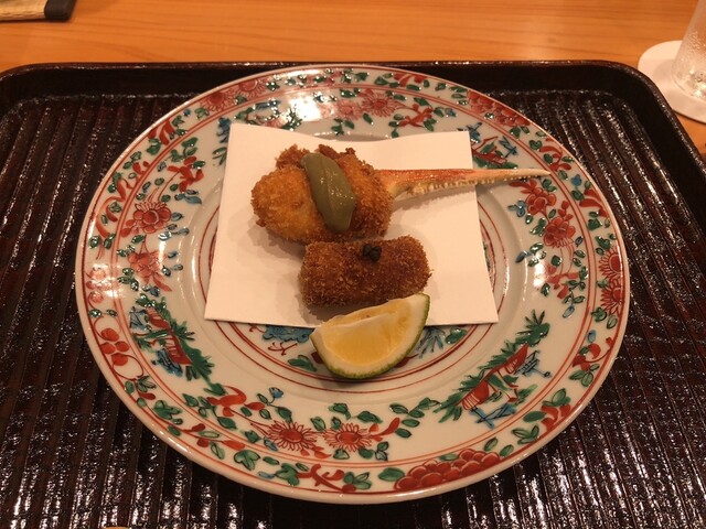 →続いては蟹爪フライと丹羽栗の渋皮煮フライという秋冬コンボ♫光井大将の蟹爪フライは永遠に食べられるフライなんですよね(^^)蟹爪身の繊維1本1本から旨みが弾けています♫そして丹羽栗は甘味が物凄いんです!少し寝かして糖度を上げた??とか色々感じながら甘さ爆発の渋皮煮フライを満喫しました(^^)/