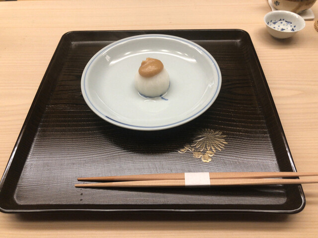 →先付は藤ノ瀬湧水で炊いた朝掘りの蕪の風呂吹きから♪蕪と湧水も綺麗な事が一口で理解できる味わい!そして蕪の上にはこれまた綺麗で穏やかな味わいの味噌が鎮座しています(^^)