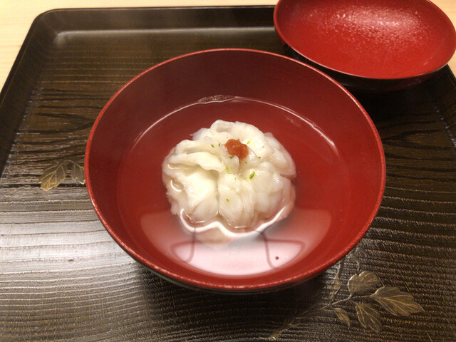 ◎氷見 虎魚の椀→先程の鰹昆布出汁を使ったお椀は…梅肉をあしらった見事な虎魚の花が咲いた椀\( ˆoˆ )/僅かな塩で整えられたお出汁の味わい!そしてこの虎魚の身のふわっふわっ感が突き抜けていました♫