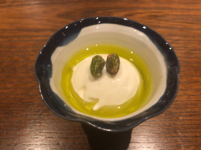 岡山県産オリーブオイル掛け山羊のミルクジェラート スペイン産ピスタチオ乗せ