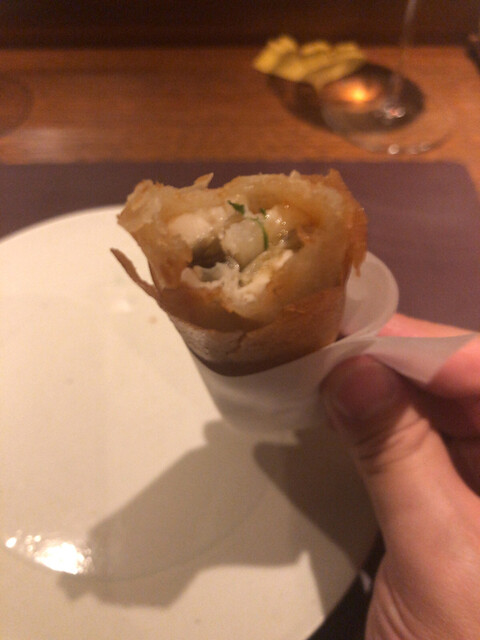 →味わい深い白と合わせるのがこの春巻的な穴子のトマト煮込を包み込んだエンパナーダ♫これっ!めちゃくちゃ旨い\( ˆoˆ )/軽やかなトマトの酸味を纏った穴子の旨味を全て包み込むエンパナーダは絶品!でも春巻だけど春巻に非ず!なのが不思議(^^)