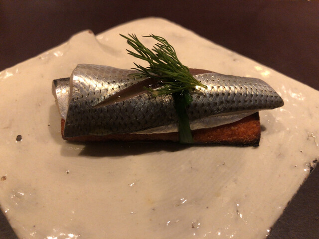 →続いてすっきりとした白と合わせるのはバルの定番!ボカディージョ(^^)このボカディージョのトマトパン♫これぞ!スペインの味わいそのもの(^O^)/そこに小鰭のマリネを使うのは東シェフ流だと思いますが、流れる味わいはスペイン料理という本線は決して崩さない!そのシェフの想いを感じた逸品(^^)旨い‼︎
