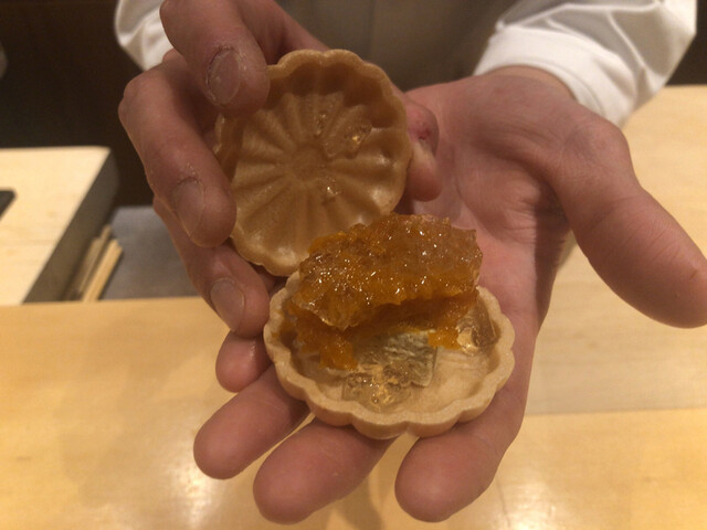 ○フォワグラとあんぽ柿とウイスキーゼリーの最中→こちらも篠原大将のスペシャリテ♪ようやく食す事が出来ました(^^)やはり楽しいですね!