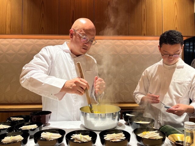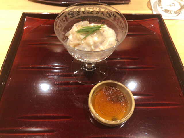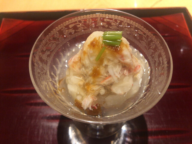 →まずは菊の花をたっぷり載せたガラスのケースが登場♫その菊の花の中から美しい逸品が眼前に!金箔もありますが、それぞれの食材が本当キラキラしています(^^)そのキラキラの中にスプーンを入れて様々な素材を掬って口に運びますが、旨みたっぷり!瑞々しさたっぷりで本当美味しい♡普通なら下地は茶碗蒸しにするところが篠原大将はずんだを敷き詰めて…またこのずんだの味わいの軽やかで美味しいこと!見事ですね!