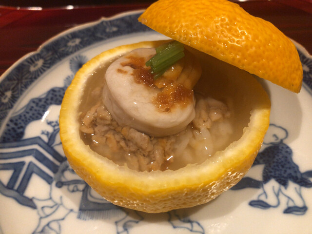 ◉紅白なます、車海老、帆立貝柱、芽甘草、水前寺のりの土佐酢煮凝りジュレ掛け 三宝柑の器で→柑橘系の果物を器に使うのも篠原大将の得意技♪この夜は新年を祝っての紅白なますに紅白の車海老!軽やかな味わいは心地良いです(^^)