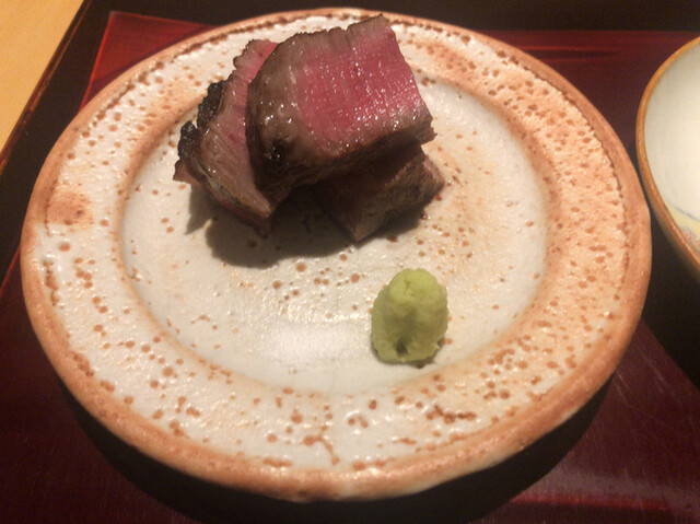 ●飛騨牛のヒレの炭火焼 山葵を添えて 漬物と共に→飛騨牛のヒレは美しい断面!お漬物も綺麗です(^^)