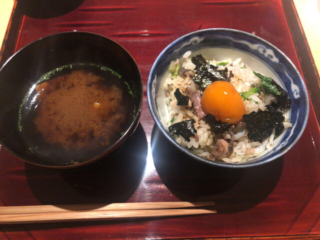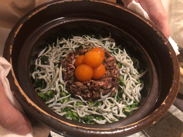 →スペシャリテの焼鼈は炊き込みご飯で\( ˆoˆ )/鮎の稚魚に菜の花!そして卵黄醤油漬け♪春の走りを楽しみつつ重厚な鼈の旨味を堪能する素晴らしい炊き込みご飯♫勿論お代わりしました!