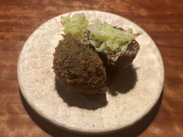 合鴨と発酵野沢菜のレアメンチカツ 発酵野沢菜と香茸パウダー掛け 春キャベツ 酢漬けを添えて