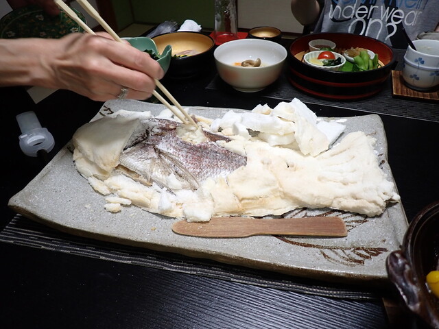 特においしかったのは、鯛の塩竃と呼子のイカの刺身と天麩羅かなあ。