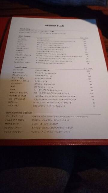 相方の誕生日祝いにハイアットリージェンシー新宿のなだ万でランチに鉄板焼をたべて、新宿で買い物などをした後、夜にまたホテルに戻って、このバーに18:00頃に2人で行ったね。【アペリティフプラン】乾杯スパークリング付き 前菜 ドリンク2杯プラン(¥3,500税サ込)を、事前にハイアットリージェンシー新宿のHPで予約して行った感じ(☆★今回の評価はこのプランの評価です)。尚、このプランは19:00までに開始する必要があるみたい(19:00を越えるとHPで予約ができない)。写真1枚目が乾杯スパークリングだね。その後、写真2枚目の前菜がでてきたね(我が家は昼にたっぷり食べたので、これで充分だったけど、ディナーとしては量は少ないかも)。これでつまみつつ酒を楽しんだね。写真3枚目が1人2杯頼めるメニューだね。以降の写真が頼んだ4杯。店員の方に聞くといろいろ教えてくれるのでそれで選ぶのも楽しかったかも。チャーリーチャップリン(アプリコットの風味がいい感じ。ALC(アルコール度)21%なので結構濃い)。マルガリータ(おいしい!ALC33%は強いね~)。ラムエスプレッソマティーニ(コーヒーとラムってあうのね。お勧め!)。チャイナブルー(これぞカクテルって感じのきれいなカクテルだね。ライチがいい感じ)。高級ホテルのバーで、1人3杯の酒が飲めて、前菜付きで2人で全部で7000円(税サ込み)はお得感がすごくあったね。カクテルとか好きでいい雰囲気で飲みたい方は、時間帯は少し早めだけどお勧め!※ちなみに普通に飲むとこのカクテルは1杯2000~3000円だったね。