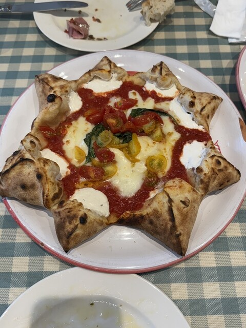 注文は鮮魚のカルパッチョと、名物「ドンサルヴォ」。ドンサルヴォは大判で、2人でシェアしてちょうど良いボリューム感。星形の“耳”部分には具が包まれていて最後まで楽しく、中央のマルゲリータ部分はモッツァレラとトマトが素直に香ってバランスが良かったです。隣の方は食べきれない分を箱で包んでもらっており、持ち帰りOKなのもよいです。店内には芸能人の写真も多く飾られており、たしかに“わざわざ来る理由”がある味だと感じました。次回は家族を連れて、前菜〜ピッツァ〜ドルチェまでゆっくり楽しみたいです。