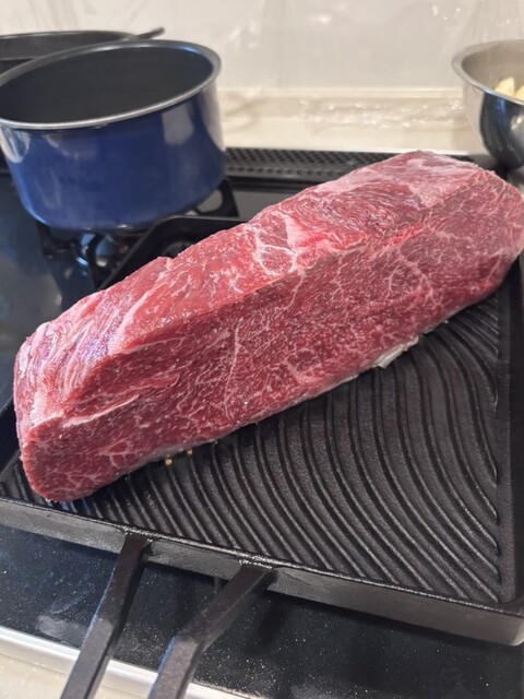 2つに切り分けて2日に分けて、焼き方を変えて愉しみました。写真は初日のもので、3回に分けて焼きました。休ませている時間も入れると、50分くらいかけて焼いてます。