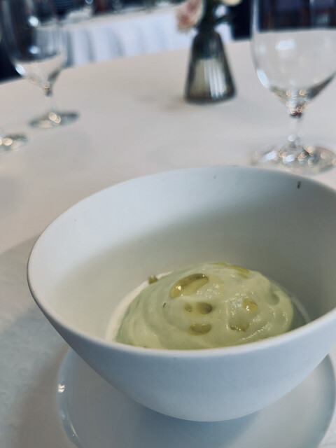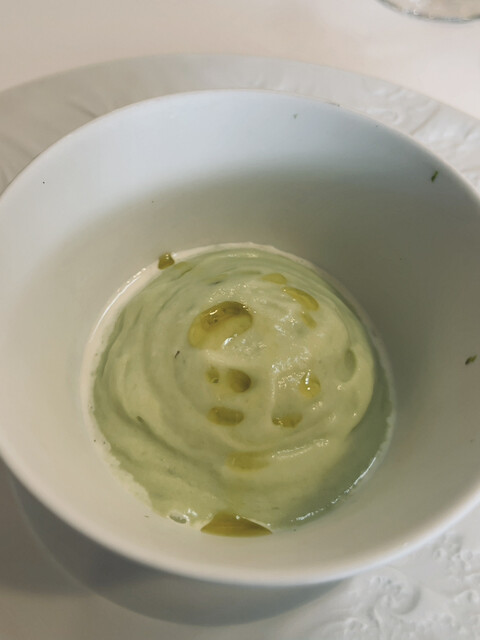 枝豆の繊細なムース、ストラッチャテッラチーズ、