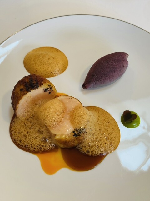 絶妙な火加減の帆立、チキン出汁のジュレ、