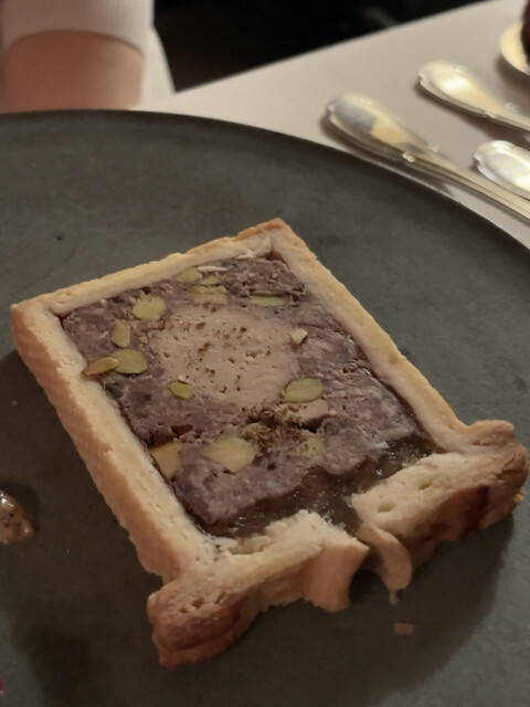 冷菜にカルガモ、フォアグラ、胡桃のバロティーヌ。家内は真鴨ささみのセッシュ。
