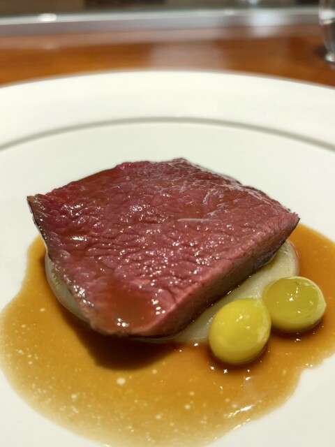 この日唯一の肉料理は井川鹿のロースト。南アルプスを望む井川地方は、鹿の名産地だそうです。ムラのない均一な肉質。ベリーなどを使った甘味の多い濃厚なソースが添えられることの多い鹿肉ですが、こちらのソースはサラッとしたジュのようなソース。肉の旨味が引き立ちます。