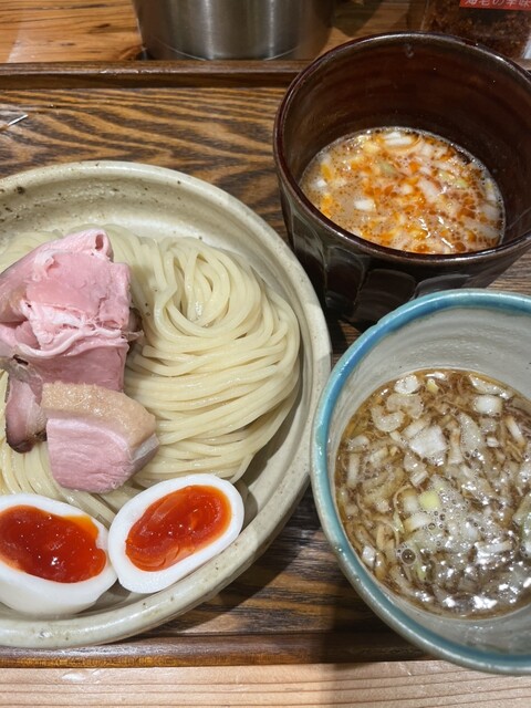つけ汁を4種の中から2種類選べるなんて斬新ですね。豚骨魚介と坦々を選びました。