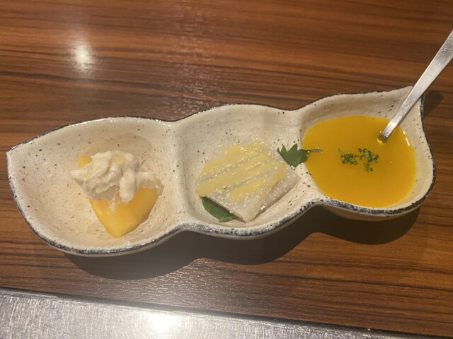 前菜3種盛り、コーネサラダ、がんす焼き、うにホーレン、お好み焼き、低温調理されたお肉など、全てが本当に美味しいです。