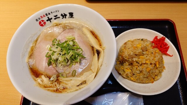 急用があり今日は有休を頂戴した。その用事も終わり昼ご飯だ。私は近江醤油ラーメン+半チャーハンセット。妻は特製鶏白湯醤油ラーメン+餃子。ここは彦根市に本社があり「十二分に心を込めて、十二分に喜んで頂きたい、十二分に満足して頂きたい」を理念とし、これから全国的に広がりを見せる新規のチェーン店だ。なぜか東北は山形県に二店舗あるだけ。近江醤油を中心に様々なラーメンにあった醤油を使い分けるコダワリの強い店。済んだスープのラーメンもあれば、ちょっとコクの強いしっかり濃いめラーメンなど10種類以上のラーメンが楽しめる。近江醤油ラーメンは我々が知る普通の醤油とは明らかに違い甘みは無いのにフルーティーな酸味が面白く、そこに若干ボソボソし角張った麺が凄く合う。鶏白湯醤油ラーメンは幅広麺がパスタのようで上品な仕上がり。また半チャーハンは熱々ながら優しい味付けでラーメンを引き立てていた、ただ、当店は発展途上のチェーン店として頑張らなきゃいけない時期だってのに麺の硬さやスープの濃淡がオーダー出来ないのは残念だ。