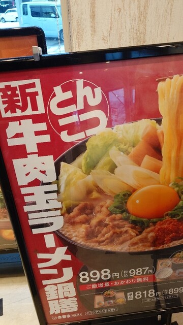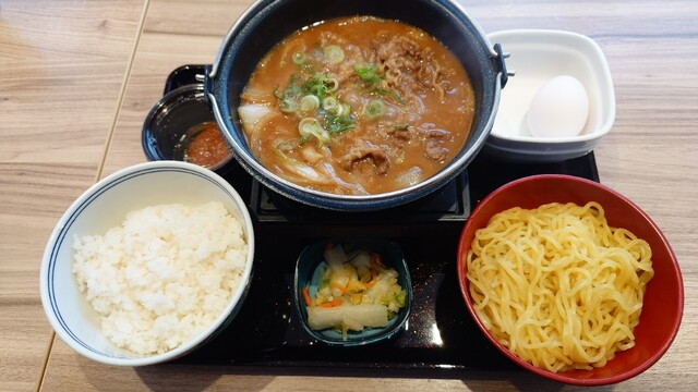 今日これから妻は夜勤で、朝ご飯を腹いっぱい食べてから仮眠したいという要望があった。また私は私で、今月8日に最大震度6強を観測した青森県東方沖の地震から1週間以内は何が起きるかわからないし、早めに自家用車の燃料を満タンにしておきたいと思いがあり急いでガソリンスタントへ行きたかった。そんな夫婦が願う両方の予定を同時に満たすのが当店だ。なんとENEOSガメイの同敷地内に吉野家があり、愛車も人間も満腹になれる。妻は牛肉玉ラーメン鍋膳(とんこつ)。私はWハムエッグ牛小鉢定食+キムチ+塩さば。昨今の人手不足によりキッチンとホールには1人ずつの人員配置で、注文から提供時間までは10分とファストフード店にしちゃスローペースだ。しかしながら、肉玉ラーメンは固形燃料でクツクツ煮込まれた鍋は贅沢そのもの。鉄鍋で焼かれたハムエッグも美味かった。