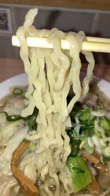 ほんのり牛を感じるがメインは豚白湯か?白濁したスープはとにかくダイナミックでパワフルな突き抜けるような旨みの重層感が圧倒的で、後から昆布や煮干しなどの和出汁の味わいも口いっぱいに広がる、そんな分厚いスープも意外とあっさりと仕上がっている。さらにアクセントとしてこの分厚いスープを胡椒が引き締め(個人的には胡椒、効かせ過ぎだが)、絶妙なクセになる味わいを演出している。途中、スタッフがおススメしてくれた卓上にあるラー油とお酢を投入するのも、ともすると単調になりがちなスープの表情を変えてくれる良いアイテムだ。