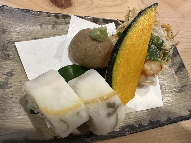 月曜日のお仕事の前泊で日曜日に京都に行かなくてはだったので、早く出て西ノ京(薬師寺と唐招提寺)のこちらのお店を食べログで見て狙いました。 京都駅発10:10発の橿原神宮行きの特急に乗って10:43に西ノ京駅着。11時開店には余裕でと思ったのですけど、開店10分前に着いたら既に8番目18人待ち。 開店後、順に呼ばれるのですがひとりだったのです比較的スムーズにカウンターに。 狙っていたお昼セットと瓶ビール(暑かったからね)。セットの胡麻豆腐、かき揚げと押し寿司が順に到着。 かき揚げもお塩でとアドバイス。 そしてざる蕎麦、これも最初はお塩で、という事。 細切りの十割蕎麦、流石でした。