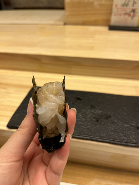 すごい分厚い身でコリコリコリコリすごい食感、本来なら固くて食べられない気もしますが、包丁が入ってることにより、コリコリをすごく楽しめます!!!おもしろい