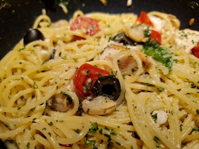 今夜はマスターのご好意で、これをアクアパッツァパスタに。