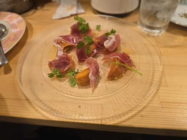 ♬.*゚柿がシャキシャキしてて、めっちゃ美味しい。生ハムと相性良いね。