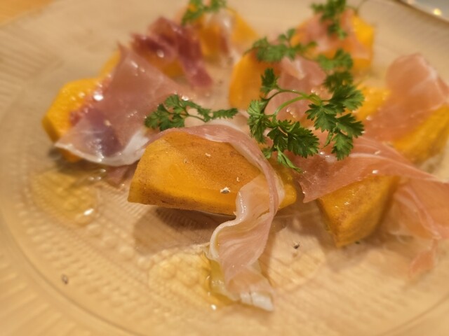 甘い柿に生ハムの塩味に、胡椒の弾ける味覚。