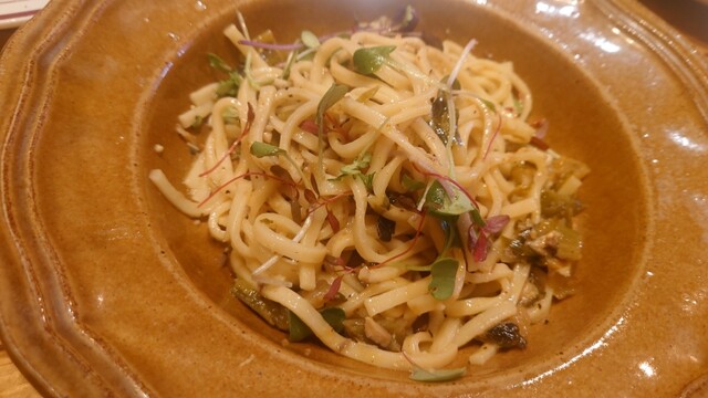 シメのパスタ この写真も混ぜてしまった写真で申し訳ない とにかくお料理が来たらすぐ食べたい性分で思い出して写真を撮る これがまた青唐辛子のピリッとした辛さがなんとも言えない 高菜大好物なので高菜が入ってるのも嬉しい 鯖がうまーくマイルドにしてる感じ