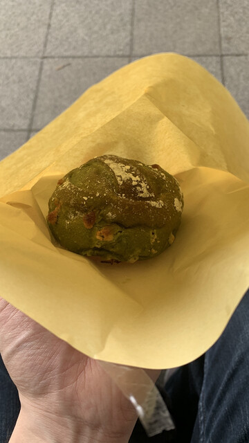 日曜14時前ごろ訪問、タワマン1階表からみえる位置にあり、外に4人くらいの待ち。決して狭いわけではないが、人気なのだと悟った。案内されて店内へ、テイクアウトのみ。ピーナッツサンド(写真なし)抹茶ホワイトチョコ500円以内くらい、口コミにもあったが、良心的に感じる値段。抹茶は比較的出来立てですぐ近くのスペースでいただいた、甘すぎず渋みがあり、もちもちで美味しい。ピーナッツサンドは冷蔵庫保管、2日後にいただいたが、これがとても美味しい。食感とか風味が落ちてるかなと思ったが、それがあったとしても、ゴマのパンの味わい、ピーナッツもペーストとクラッシュされたピーナッツが入っており、単調では終わらない味わい。もっと他にも気になった商品もあり、コスパも良いので近所の方が羨ましいパン屋さんであった