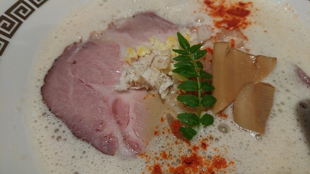 鯛清湯『さらり』は、レアチャーシュー・メンマ(○型・▽型)・鯛のほぐし身・鯛の皮揚げ・刻み玉葱・ディル・ネギがトッピング、コシがありツルっと喉越しよい中細ストレート麺に魚介ベースの塩味、天然真鯛からじっくり弱火で旨みを抽出 カキのオイルで香り高く仕上げたスープはやや油分多め 鯛風味の旨みと深みあり コクと程よい塩分で "さらり" と美味しいです。鯛の皮揚げはパリパリの食感で箸休めに…一緒に添えれた牡蠣のアヒージョを入れると よりオイリーな牡蠣風味が広がって違った美味しさ。