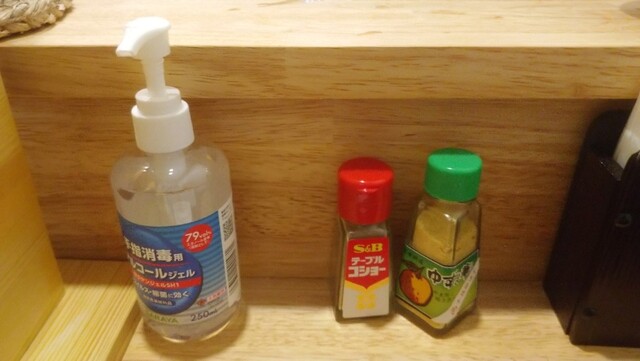 卓上調味料はコショー・ゆずの華(ゆず胡椒)があります。カウンター6席(仕切りあり)の小ぢんまりした店内を店主1人で切り盛り、店外入口付近には混雑時に名前を記入する用紙が置いてありました。