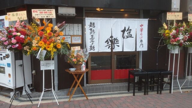 もう少し早いタイミングで再訪したいと思っていた「中華そば専門 塩楽」年明け1月6日にお伺いしました。13時到着 店外には外待ち椅子3脚と入口付近に消毒液が設置されています。店内に入ると1席だけ空いており丁度満席となりました。。今回は ”海老中華そば” を注文…同時に現金先払いします。
