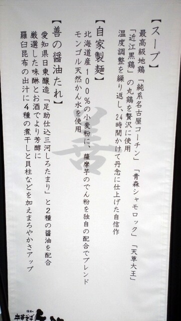 善の中華そばは、チャーシュー(肩ロース・鶏ムネ)・メンマ・小松菜・アーリーレッド・白ネギがトッピング、もっちりコシがありツルっと喉越しよい中ストレート麺に鶏(純系名古屋コーチン・青森シャムロック・天草大王・近江黒鶏)ベースの醤油味 油分多め適度に塩分を効かせた味付け 熱々のスープはしっかりした鶏の旨みとコクがあってとても美味しいです。久しぶりにレベルの高い中華そばを頂き スープも完飲。
