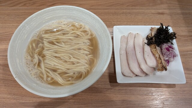 別皿に盛り付けられた低温調理の鶏むねチャーシューはしっとり 炙った鶏モモチャーシューは香ばしくスープに浸しながら頂くと抜群に美味しい。〆にライスを追加注文しスープにほり込んで完食、大満足の一杯でした。
