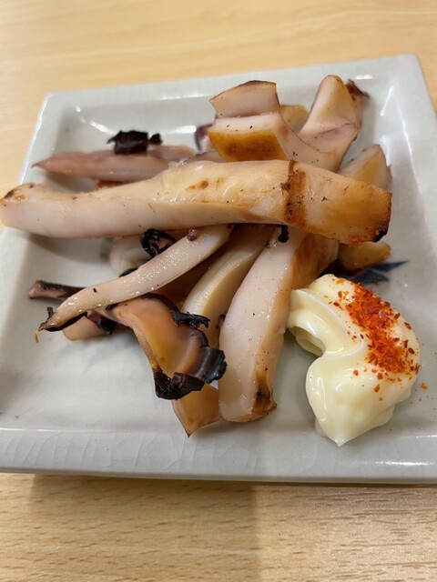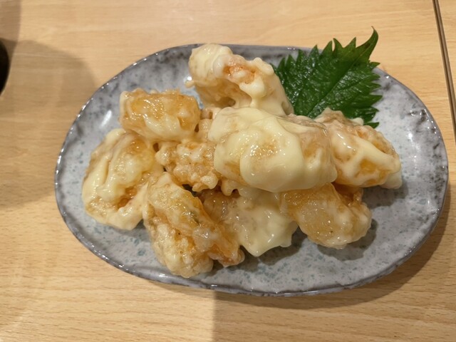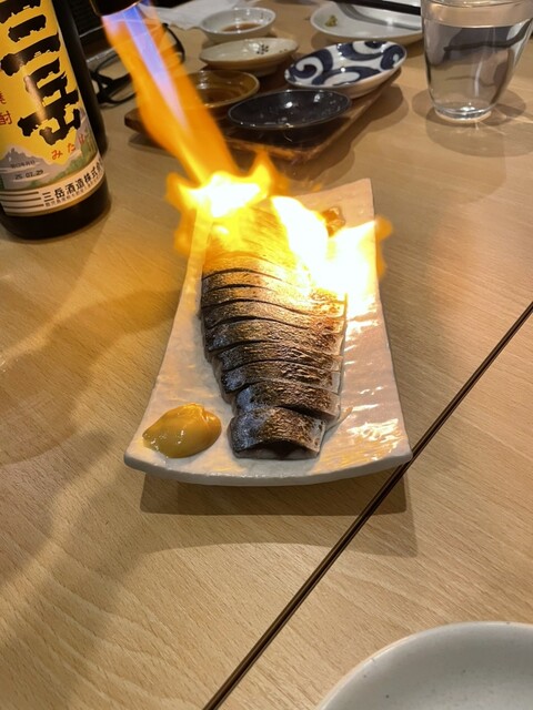 料理はお通しのおでんに始まり刺身!ポテサラとどれも美味。新メニューの牡蠣グラタンと炙りしめ鯖もいただきました。しめ鯖はお願いしてテーブルで炙っていただきました。映えるかな?
