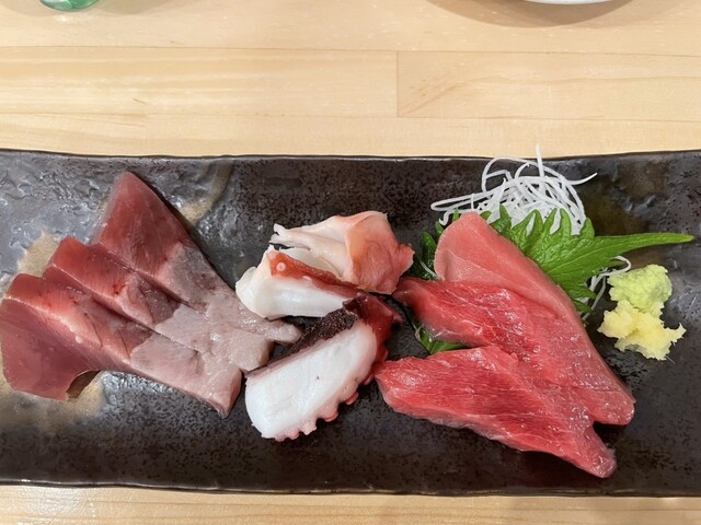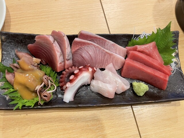 刺身盛り合わせ、カツオ、カジキ、つぶ貝、ホタルイカ
