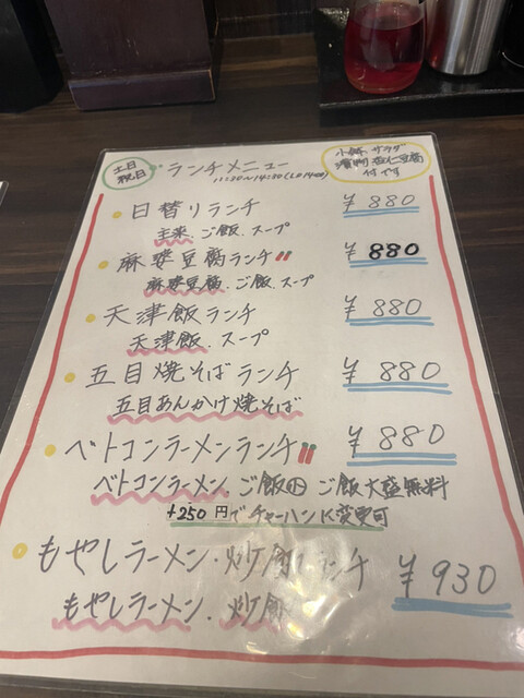 メニューは土日もランチメニューがあり、麻婆豆腐ランチにプラス250円追加で白米を炒飯に変更