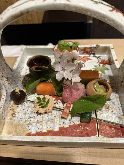 八寸は美しい、イカナゴのくぎ煮、蒸しちらし寿司、そら豆、河内鴨のロースト、6時間焼いた玉子カステラ、赤貝白和え、サーモンのホワイトアスパラ巻き、玉蒟蒻・鯛の子・えび・きゅうりの串