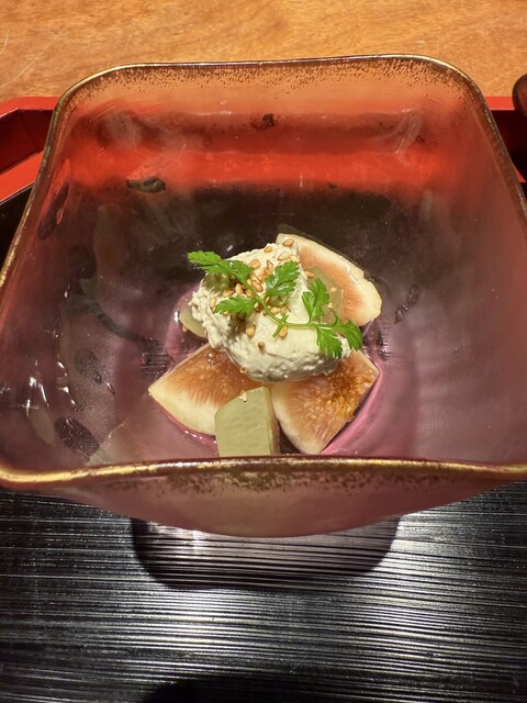 口直しは羽曳野のイチジクとマスカット、トップには豆腐と胡麻のムース 組み合わせがいい。豆腐と胡麻で胡麻豆腐の風味 面白い