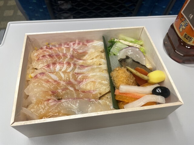 上品な包装、木箱を開けると爽やかな酢の香り。ゆずと甘酢生姜がふんだんに混ぜ込まれ、しっかり味のついたご飯に鯛の薄造りが隙間なく乗っています。鯛の身は大ぶりで、立派な一尾だったのだろうなと思いを馳せながら箸を進めます。