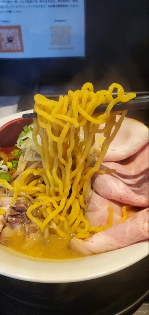 牛肉はもちろん、ハマグリや牡蠣などの貝類に鯛や蟹、昆布などの魚介類を大量に入れたスープは、やや塩味強めで素材の旨みが濃厚! 1口目のインパクトが強く、平打ち麺との相性も良く美味い!
